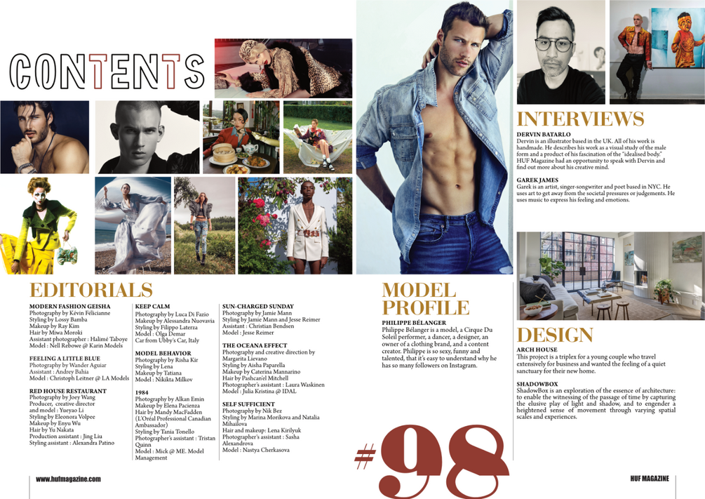 Also in this issue, we have a model profile feature with Philippe Bélanger, he's not just a model but also a Cirque Du Soleil performer, a dancer, a designer, an owner of Design Kontrol and a content creator.